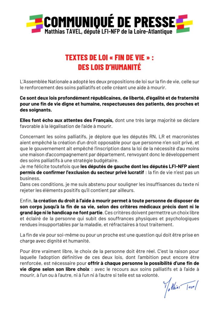 Concernant les soins palliatifs, je déplore que les députés RN, LR et macronistes aient empêché la création d’un droit opposable pour que personne n’en soit privé, et que le gouvernement ait empêché l’inscription dans la loi de la nécessité d’au moins une maison d’accompagnement par département, renvoyant donc le développement des soins palliatifs à une stratégie budgétaire.